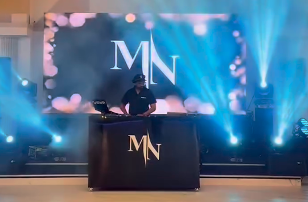 Professional DJ setups for receptions, including personalized playlists, sound, lighting and special decor to create a vibrant atmosphere.